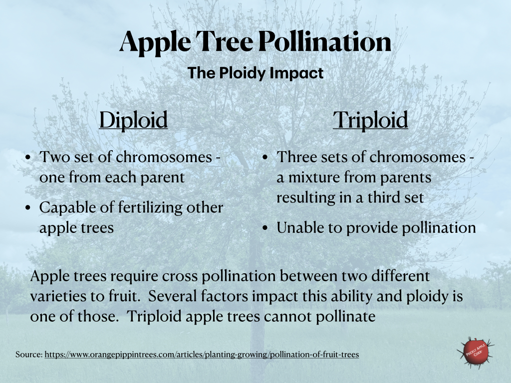 For reference, humans are diploid. We receive one set of chromosomes from each parent. Many apple trees are also diploid but not all. Unlike mammals, plants can more easily become polyploid, having multiple sets. You might think this would make them super pollinators because they have more chromosomes. However, it actually makes them sterile. They are unable to provide pollination. If you planted two tree that have overlapping bloom times and one was a diploid and the other a triploid, don’t expect the diploid variety to bear fruit. It will pollinate the triploid variety but the triploid won’t be capable of pollinating the diploid in return. You would need a third diploid variety to ensure good cross-pollination.