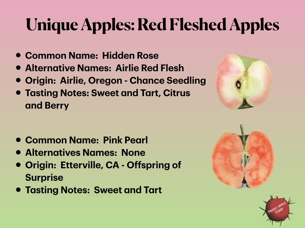 Have you ever eaten a red apple? Not red on the outside, but red on the inside. I must say that there is this appeal of biting into an apple and finding this pink or reddish colored flesh. Even when you know it’s there, you still never really know how vibrant it will be and it is still likely to surprise you. In fact, one of the earliest red fleshed apples that I’ve read about is called Surprise so the name says it all. I finally had my first red fleshed apple just last year. I’ll never forget the memory of biting into a freshly picked Hidden Rose apple to discover this reddish pink flesh staring back at me. It’s still amazing and when I learned the orchard had a couple other varieties, I had to return earlier this year to pick some. I had my first Pink Pearl apple last weekend. It was definitely redder than the Hidden Rose with a nice tartness. While the tree only had a half dozen apples, the joy of being able to pick them and biting into it to find this myriad of red colors was amazing. The Pink Parfait tree sitting next to it has many more apples and I know where I am heading in October once it’s ripe!